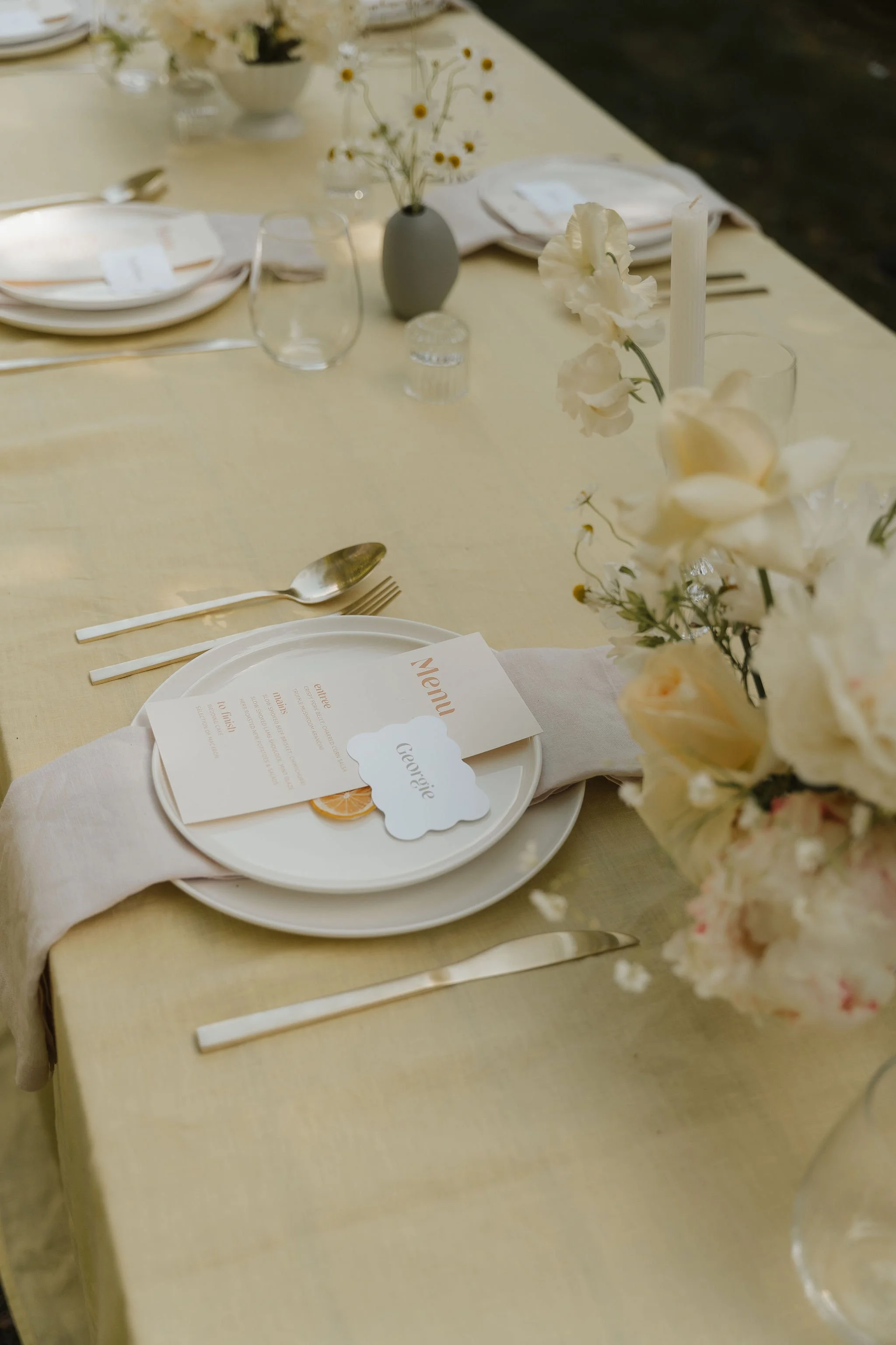The choice of venue was pivotal, and the garden became our canvas. Its tranquil setting provided the perfect scene for our vision. Soft greens and creams adorned the table settings, harmonizing effortlessly with the natural surroundings. We chose beautiful linen from Tble, furniture and dinnerware from Stellar Events and on trend signage by Three Sisters Studio. All the table decor was meticuously chosen to match the surroundings and we were jumping with delight when we saw it all come together in the drive and especially below the magical large weeping beech tree